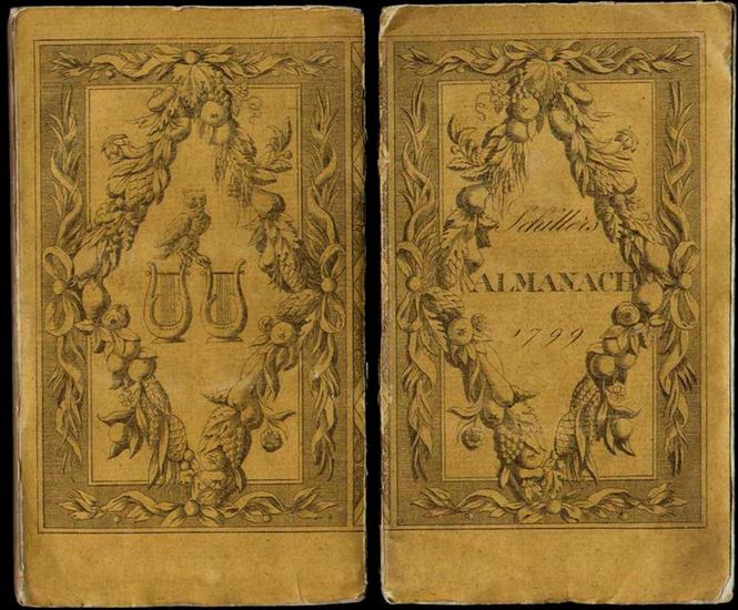 Musen-Almanach für das Jahr 1799. Herausgegeben von Schiller. Tübingen, in der J.G. Cottaischen Buchhandlung., (1798). Klein-8°. 8 Bl., 247 S., 1 S. Mit gestochenem Frontispiz von Guttenberg nach H. Meyer. Gelbe illustrierte gelbe Originalbroschur nach H. Meyer in späterem Pappschuber. Goedeke V,207,5. - Marcuse 166. - Kippenberg 555. - Borst 845. - Mit Erstdrucken von Schiller, Goethe, Hölderlin, Matthisson, Sophie Merau, A.W. Schlegel, Tieck u.a. - Rücken mit 2 Fehlstellen. Titel und Kalendarium etwas fleckig und gebräunt. - Unbeschnittenes und ungeöffnetes Exemplar in der schönen Originalbroschur.