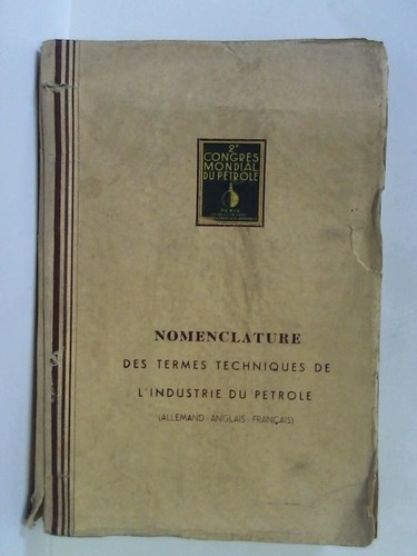 Nomenclature des Termes Techniques de L'Industrie du Petrole (Allemand - Anglais - Francais) Paris, Selbstverlag, 1937. 303 Blatt in getrennter Zählung, gelocht, in original Papp-Schnellhefter, quart, (Hefter fleckig/Rücken eingerissen/Hefter mit Knickspuren)---- II. Congres Mondial du Petrole, Paris 14 - 19 Juin 1937 / dreisprachiges Wörterbuch: farnzsösisch, deutsch und englisch -.