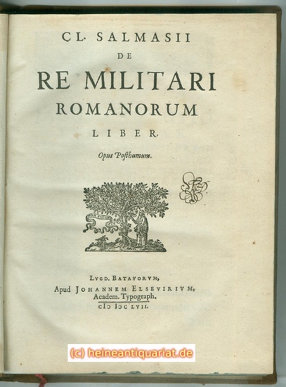 CL. SALMASII DE RE MILITARI ROMANORUM LIBER: Opus Posthumum. [Druckermarke "Eremit", Rahir "M. 7"]. LVGD.[UNUM] BATAVORVM (Leiden), Apud JOHANNEM ELSEVIRIVM [Jean Elzevier], Academ.[icorum] Typograph.[orum] MDCLVII (1657). 6 Blätter, 243 Seiten. Späterer, auf dem Rücken mit Titelprägung und Filetenvergoldung, sowie Lederecken und allseitigem Farbschnitt versehener Halblederband. (23,3 x 18,8 cm, bzw. 22,4 x 17,2 cm; Buchblock: 1,3 cm) Gr.8°. Pieters 71 auf S. 173 ("Edente Georg. Hornio."). Willems 808 ("Marque: Le Solitaire. 6 ff. limin. - 243 pp. Saumaise avait entrepris ce traité vers 1634, à la demande du prince d'Orange, qui désirait connaître 'la manière de camper des Romains [Hmmm, die Römer als Inspiration für das holländische Camping ! CS] et celle de ranger en bateille.' Suivant le désir du prince, il rédigea d'abord en français. En 1637 il se rendit à Paris pour le faire imprimer, mais ne trouva pas d'éditeur disposé à en charger (Salmasii Epist., p. 189). Les Elzevier se montrèrent plusaccomodants. L'impression était déjà assez avancée en 1644 pour que l'ouvrage fût porté (sans indication de prix) dans le catal. officinal publié en cette année. Nous voyons par ce document que le traité de Saumaise devait paraître simultanément en latin et en français. Malheureusement l'auteur, engagé en d'incessantes controverses, n'avait guère de temps à consacrer à son oeuvre. on pas qu'il la perdît de vue: au contraire, il se promettait constamment d' y revenir. Ainsi, en 1648, il déclarait qu'il allait y travailler sans désemparer, aussitôt qi'il aurait mis au jour son écrit contre Didier Hérault (n° 645); c'est du moins ce que marquaient les Elzevier à Cl. Sarrau, qui ne manqua pas d'en féliciter Saumaise: 'Scribit Elzevirius junior te, post absolutum librum contra Heraldum, totum jam esse in adornanda militia romana.' (Sarravii Epist., p. 186.) Mais ces bonnes résolutions ne tinrent pas. A peine débarrassé de Hérault, Saumaise s'embarquait dans une nouvelle polémique à propos de l'exécution de Charles Ier d'Angleterre, tant et bien qu'il mourut, en 1653, avant d'avoir mis la dernière main àson livre. Pris au dépourvu par cet événement, les Elzevier résolurent d'en finir une bonne fois, et de mettre en vente l'ouvrage tel quel: 'Salmasii commentarius de re militari iam ante decennium edi coeptus est,' écrit N. Heinsius, le 18 avril 1654, 'finem operi se iam imposituros Elzevirii minantur, quaquam mutilo et imperfecto.' (Epist. ad Magliabechium, t. I, p. 197.) Mais ils se ravisèrent par la suite, et le soin de la publication fut confié à G. Horn. Celui-ci accepta cette tâche, et le Traité de la Milice romaine parut enfin en 1657, avec une préface de l'éditeur. Le volume es dédié par Jean Elzevier à J. Aug. de Thou."). Minzloff S. 193 f [unklar welche Variante]. Winterthur 991 [unklar welche Variante]. Goldsmid III, 39. Rahir 812 ("Dans cet ex. les mots Re Militari sur le titre sont imprimés avec des caractères mesurant 7 mm. de hauteur, la dernière page est ornée du fleuron l'ours assis avec les palmes croisées (n° 60)." [Unter No. 813 beschreibt Rahir eine Variante in der die Wörter Re Militari 10 1/2 mm hoch sind und die Schlußvignette Rahir 55 ist. Ansonsten fielen ihm keine Unterschiede auf.] Unser Exemplar mit den größeren Typen auf dem Titel, aber dem Bären auf der Palme als Schlußvignette ?). Berghman 1980 ("Ouvrage achevé et publié par G. Horn."). Copinger 4066 ("Final tailpiece: - bear and palms. W. 808: B. 1980: R. 812.") [unter No. 4067 beschreibt er: "The same. (Tailpiece: - triangle)."]. R. 813."). Broman 227 ("Rahir 812 - 813. Berghman 1980. Vergl. Socoloff I A 517, sowie "Dernières acquisitions" 7. Copinger 4066 - 4067."). Vergl. Motteley (1824) 2025. Motteley (1848) 118. Vergl. Costabili 2185 [unklar welche Variante]. Lengfeld 217 ("R. 812."). Drouot (1946) 178 ("Exemplaire avec les mots e Militari sur le titre mesurant 10 mm 1/2 de hauteur, mais avec le fleuron à l'ours assis à la dernière page.").Phiebig 286 + 287. Thulins 325, 100. EHC 04.1657.Sal.00 - 02 [bei allen drei Exemplaren unsicher, ob Copinger 4066 oder 4067 vorliegt]. Weddigen 137. - Bisher nicht beschriebene Mischvariante aus Rahir 812/ Copinger 4066 und Rahir 813/ Copinger 4067 mit einem ebenfalls bisher unbeschriebenen fleuron, ein verkürztes "Rahir 42" ! - Der spätere Halblederband etwas fleckig und besonders am Rücken verblichen, fleckig und an einer Stelle mit kleiner Fehlstelle, mit Lederecken versehen und allseitigem Farbschnitt, insgesamt etwas berieben und bestoßen. Der Innenspiegel mit Leimschatten, innen kaum fleckig und gebräunt. Vergl. den Matthiae (Weddigen 131), der vom gleichen Buchbinder angefertigt wurde. Mit der gedruckten Widmung des Johann Elzeviers für Jacques Auguste de Thou ("JACOBO AUGUSTO THUANO"). 1634 von Saumaise auf Wunsch des Prinzen von Orange begonnen, wurde es erst nach seinem Tod und mehr als 20 Jahre nach den ersten Anfängen endlich vom Historiker Georg Horn nach dem Manuskript abgeschlossen und für den Druck vorbereitet, der dann 1657 tatsächlich erfolgte. Vorangegangen waren jahrelange Ausflüchte und nicht gehaltene Versprechen - schon 1644 wurde es im Katalog angezeigt - selten hielt ein Autor seine Verleger so lange und erfolgreich hin ! Eine weitere Besonderheit ist das fleuron auf Seite 1, das in dieser Form weder von Rahir, noch von Berghman beschrieben wurde u.W. hat es bisher auch noch kein anderer Bibliograph bemerkt. Am ähnlichsten ist es Rahir 42, wenn man sich rechts und links das jeweils letzte, durch Ranke und Blume gebildete Teilstück nach den Hunden wegdenkt. Daß es sich um die identische Druckvorlage handelt, sieht man daran, daß links der Ansatz für das "fehlende" Stück vorhanden ist, er verläuft unter dem kleinen Blatt, auch rechts ist er zu ahnen. Möglicherweise wurden die Endstücke abgedeckt, oder aber auch völlig entfernt, weil das fleuron in se