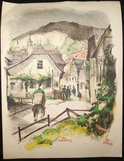 Vom Weingelände Wiens. 6 Steinzeichnungen. Wien, Vlg. d. Ges. f. vervielfält. Kunst (1926). 6 farb. Orig.-Lithogr., 38x28 cm, lose in OKart.-Mappe, Umschlag etwas abgegriffen, Mappe mit eichte Knickspuren, Blätter tlw. schwach gebräunt. "Titel der Blätter: Bockkellrgasse; Alt-Sievering; Alt-Grinzing; Eroicahaus in Heiligenstadt; Im Kahlenbergerdorf; Leopoldsberg, Kahlenbergerdorf. - Thieme-B. XXVII,185; ÖBL.".