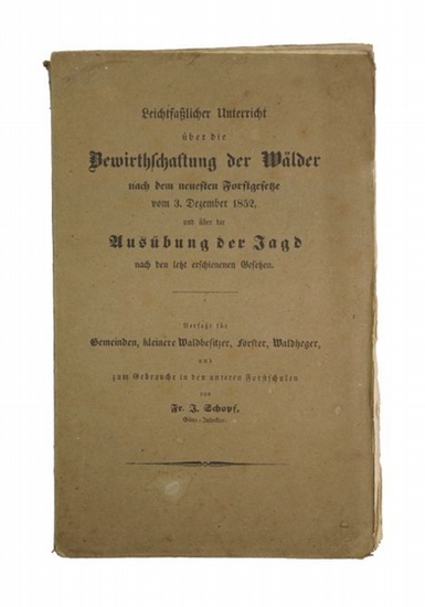 Leichtfaßlicher Unterricht über die Bewirthschaftung der Wälder nach dem neuesten Forstgesetze vom 3. Dezember 1852, und über die Ausübung der Jagd nach den letzt erschienenen Gesetzen. Verfaßt für Gemeinden, kleinere Waldbesitzer, Förster, Waldheger und zum Gebrauche in den unteren Forstschulen. Graz, Jos. A. Kienreich, 1853. Gr.-8°. 2 Bll., 148 S., OBrosch. Erstausgabe. - Umschlag m. kl. Läsuren u. leicht fleckig. Die unbeschnittenen Ränder etw. bestoßen. Etw. gebräunt u. stockfleckig. - Lindner 11.1851.01.