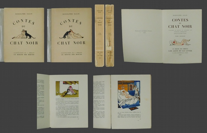 Contes du Chat Noir. Illustrés de dessins en couleurs par Joseph Hémard. Préface de George Auriol. Paris, Le Miroir des Moeurs. Les Arts et le Livre., 1927. In-8°. 3 f. n.ch., XXIV p., 1 f., 281 p., 5 p.n.ch. table; 2 f. n.ch., 278 p., 4 f. n.ch. Avec 180 dessins aquarellés. Broché, couvertures illustrées et rempliées. 2 vol. Première édition avec les illustrations de Hémard. - 1/65 exemplaires numérotés de tête sur papier d'Annam (avec 1100 sur vélin). - Déchirures au dos, sinon très propre.
