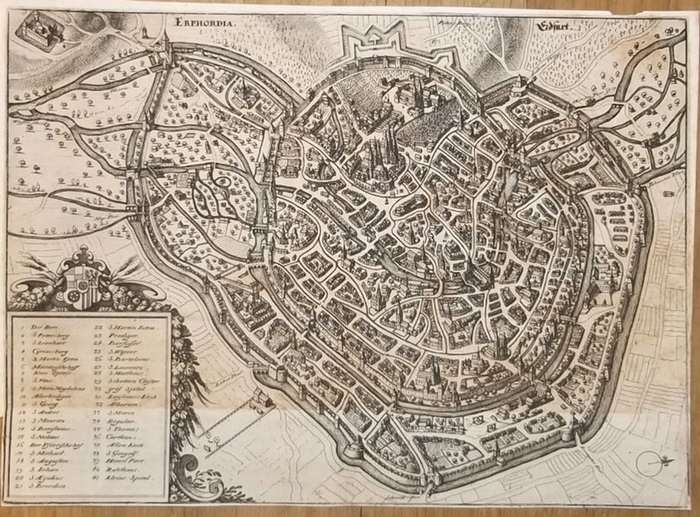"Erphordia. Erdfurt.". Kupferstich von Matthäus Merian. Aus: Theatrum Europaeum. Frankfurt, Merian, 1635 ff. Ca. 23 cm x 32 cm. Schöne Gesamtansicht von Erfurt aus der halben Vogelperspektive. - Allseitig knapp beschnitten und großteils auf altes Papier kaschiert. Gebräunt.