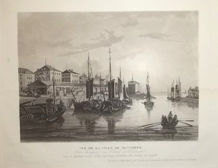 "Vue de la Ville de Mannheim, Prise du port vers l'hotel de l'Europe.". Aquatinta. Schaffhausen, Louis Bleuler, Um 1840. Ca. 12 cm x 16,5 cm (Bild). Schöne Teilansicht der Stadt Mannheim mit Hafen in Richtung Hotel Europa. - Im Bild gering wasserrandig, im Rand gering braunfleckig.
