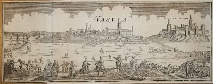 "Narva. Ivannogorod. ". Kupferstich. _. Ca. 15,5 cm x 40 cm. Schöne Gesamtansicht von Narva mit der Hermannsfeste über den Fluss Narva auf die Festung Iwangorod. Im Vorder- und Mittelgrund reiche Figurenstaffage. - Kaum gebräunt. Allseitig knapp beschnitten und großteils auf altes Papier kaschiert.
