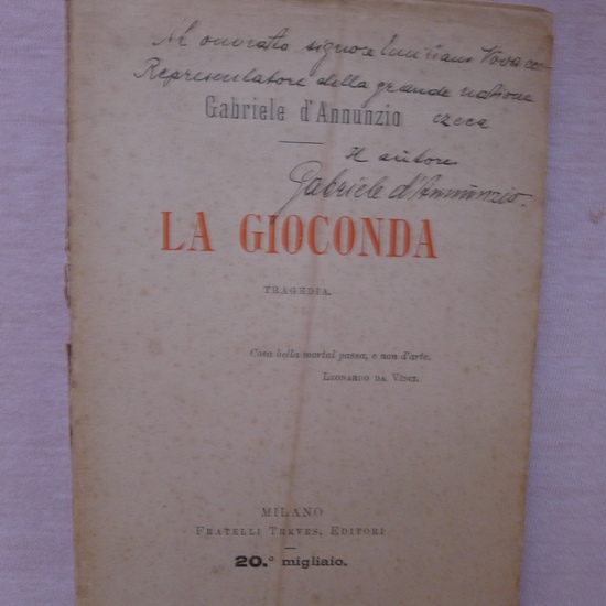 La gioconda Tragedia,. Milano, Fratelli Treves, 1914. 218 S., OKart.,, Annunzio. Rücken lädiert, Buchblock gerissen, Titelblatt stockfleckig, sonst gut erhalten Hs. signiert: "Al onorato signore Emiliano Novacco Representatore della grande natione czeca il autore Gabriele d'Annunzio".