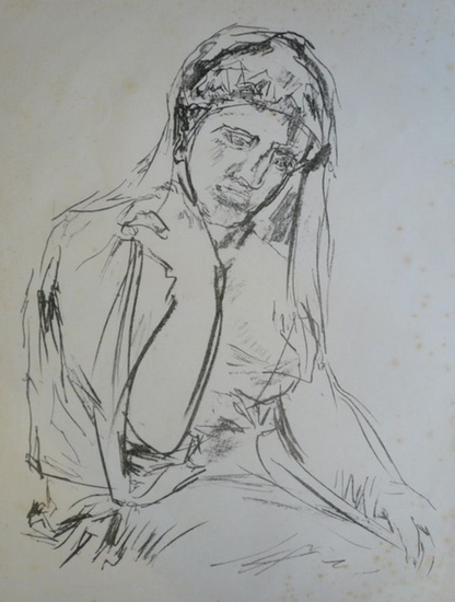 Die Abgeschiedene. Lithographie. 1961. Druck auf Japanbütten. 58,1 x 44,8 cm. Papier:. Wingler/Welz 265. - Kokoschka hat ein bemerkenswertes druckgraphisches Werk hinterlassen. Bei seinen druckgraphischen Arbeiten bevorzugte er meist die Lithographie (WW S. 7). Im Spätherbst 1961 unternahm Kokoschka eine Griechenlandreise, dessen Eindrücke er in dem Zyklus "Bekenntnis zu Hellas" verarbeitete. Das Blatt entstand im National-Museum in Athen und geht wohl, ebenso wie die "Trauernden Frau" (WW 242), auf den Typus der "Trauernden Penelope" zurück. - Vorwiegend im Randbereich mit Braunflecken. Eine schwache Knickspur im unteren Darstellungsbereich.