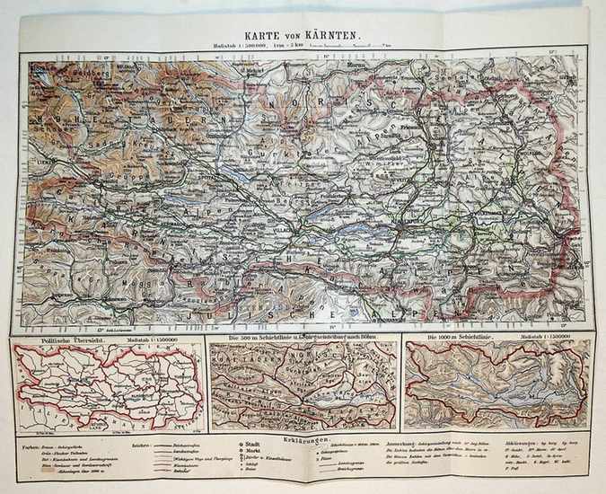 K?RNTEN - Karte von K?rnten. Ma?stab 1:500 000 s.l., s.n., [um 1910]. Formatangabe ca 37 x 31 cm, gefaltet zu 12 Segmenten, Ausgabe: mehrf?rbig ; Zustand: ein kleines Loch an einer Falzecke, sonst gut +. mit politischer ?bersicht, 500 m Schichtlinie und Gebirgseinteiung nach B?hm, 1000 m Schichtlinie Ma?stab 1:1500000, Erkl?rungen <1:500000>.