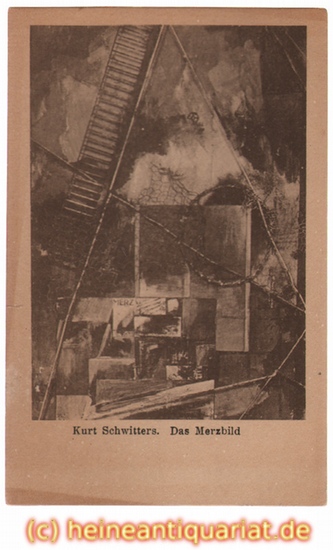 Das Merzbild. Hannover, Richard Blumenthal [1919]. Offsetlithographie nach dem Gemälde als Original-Postkarte. (14,2 x 9 cm) 12°. Seltene, ungelaufene Original-Postkarte der Zeit im Vertrieb der Papierwarenfabrik Richard Blumenthal, Hannover. Auf bräunlichem Karton gedruckt. Das Original-Gemälde ist im 2. Weltkrieg verschollen.