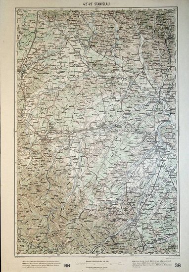 Stanislau - Land: Galizien/Ungarn (= General-Karte von Mittel-Europa 1:200 000. 105. 42? 49?) Wien, Kaiserlich-K?nigliches Milit?r-Geographisches Institut, 1914. Hochformat, ca. 38 x 55 cm, Ausgabe: mehrf?rbig; Zustand: gut +. Blatt 105 von 282 vgl. Regele, Oskar: Beitr?ge zur Geschichte der staatlichen Landesaufnahme und Kartographie in ?sterreich bis zum Jahre 1918. Wien, Verlag des Notringes der wissenschaftlichen Verb?nde ?sterreichs, 1955. S. 84.
