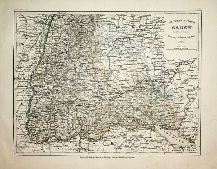 DEUTSCHLAND / GERMANY, GRO?HERZOGTUM BADEN S?DEN / GRAND DUCHY OF BADEN SOUTH, MAP 1856 LANDKARTE: Titel: Grossherzothum Baden S?dliche H?lfte etc. 1856 Hildburghausen, Verlag Bibliographisches Institut, 1856. original map, original steelengraving, old colours, / original Landkarte, original Stahlstich alt teilkoloriert, Blattformat ca. 23,5 x 30 cm. ORIGINAL MAP, ORIGINALE LANDKARTE.