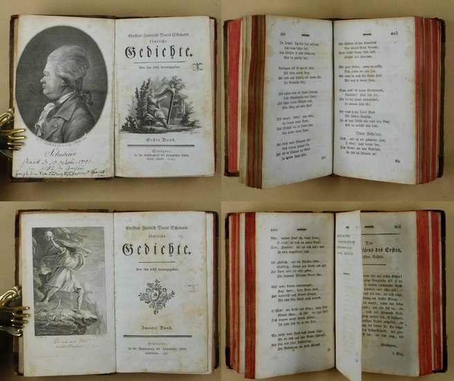 Sämthliche Gedichte. Von ihm selbst herausgegeben. Stuttgart, in der Buchdruckerei der Herzoglichen Hohen Carl-Schule, 1785-1786. 8°. 456 S.; 4 Bl., 435 S., 1 Bl. Mit einem gestochenen Porträt Schubarts von C.J. Schlotterbeck, einem Titelkupfer und 2 Textvignetten von J.F. Leybold nach N. Touret. Halblederbände mit rotem goldgeprägtem Rückenschild 2 Bände. Goedeke VI/I, 870, 288b. - Rümann 1050. - Borst 512. - Schulte-Strathaus 52a. - Erste Ausgabe. - Einbände stark beschabt und bestossen. Beide Bände stellenweise fleckig. Exlibris F.H. Rheinwald auf der Titelrückseite.