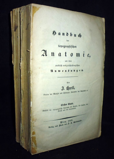 Handbuch der topographischen Anatomie, und ihrer praktisch medizinisch-chirurgischen Anwendungen. 2 Bände. Wien, Wallishausser 1847. "XVI, 523 S.; XII, 427 S.; Interimsbrosch., nur vord. Umschl. v. Bd. 2 vorhand., dieses händisch beschriftet, randrissig, stockfl. u. verstaubt, tlw. in Lagen gebrochen, ungleich geschnitt., starke Staubränder u. tlw. etw. randrissig, innen guter, sauberer Zustand." Erstausgabe. - HYRTL, Josef. (1810-1894), österreichischer Anatom. Dieses, sein Hauptwerk wurde weltweit zu einem der wichtigsten Lehrbücher an medizinischen Schulen.
