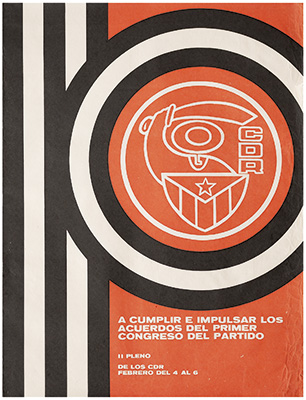 A cumplir e impulsar los acuerdos del primer congreso del partido. Il pleno de los CDR febrero del 4 al 6. [Havanna], [1978]. 1 Bl. 530 mm X 695 mm. Die Komitees zur Verteidigung der Revolution (CDR) unterstehen der kubanischen Staatsregierung und gelten als Auge und Ohr der Partei. Diese 1960 gegründete flächendeckend existierende und agierende Nachbarschaftsorganisationen dienen nicht nur als engmaschiges Informations- und Sicherheitsnetz, sondern nehmen auch soziale Aufgaben war, wie z.B. die Nahrungsmittelversorgung in den Wohngebieten. Der erste Kongress der CDR fand zwischen dem 24. und 28. September 1977 im Karl-Marx-Theater in der Stadt Havanna statt. Das Vermutlich 1978 erschienene Plakat ohne namentlich erwähnten Gestalter_in ruft zur Erfüllung der Vereinbarungen des 1. Kongresses auf und lädt zu einer Sitzung der CDR vom 4. bis 6. Februar ein. - Plakat am unteren Rand knickspurig und mit kleinem Einriss, sonst guter Zustand.
