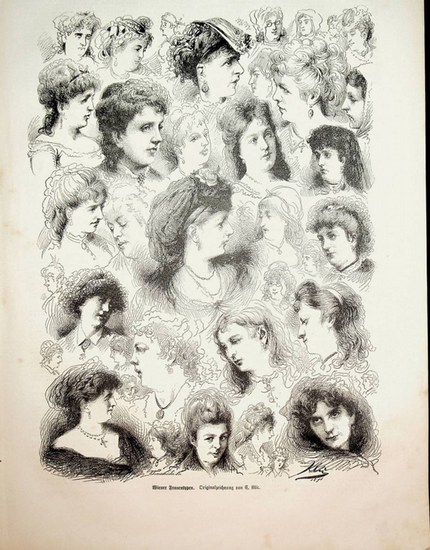 WIEN, WIENER FRAUENTYPEN, antike Grafik ca. 1870 ca. 1870. original Xylographie, Bild ca. 30,5 x 22 cm. Antique Print, antike Grafik.