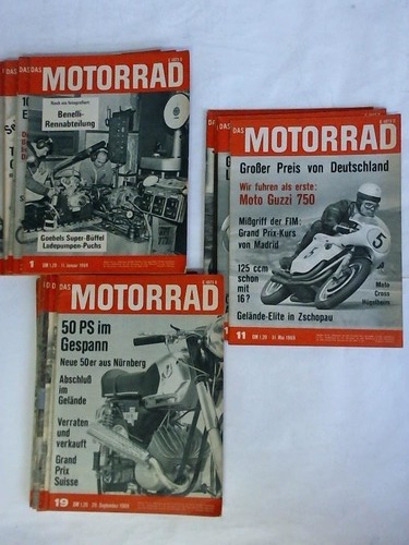 Die deutsche Motorrad-Zeitschrift - 21. Jahrgang 1969, Heft 1 bis 15 und Heft 19 bis 26. Zusammen 23 Hefte (von 26 Heften) Stuttgart, Motor-Presse-Verlag, 1969. Je Heft ca. 32 S. mit vielen Abbildungen, broschierte Hefte, quart, (geringe Gebrauchsspuren/ohne Heft Nr. 16, 17 und 18)---- sonst gute Exemplare -.