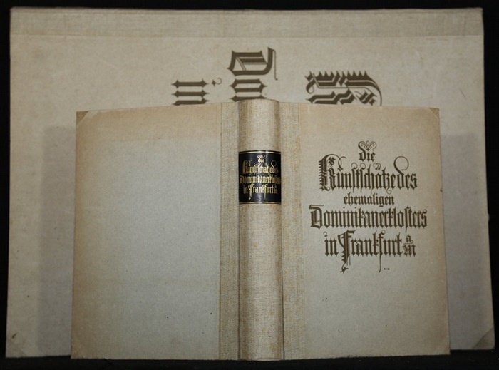 Die Kunstschätze des ehemaligen Dominikanerklosters in Frankfurt a.M. Nach den archivalischen Quellen bearbietet und herausgegeben. Mit Unterstützung der Administration des Dr. Johann Friedrich Böhmerschen Nachlasses. Textband und Tafelband (in Großfolio). München, F. Bruckmann, 1923. Textband: 28,5 x 20,5 cm. XXVIII, 389 (3) Seiten und 69 Abbildungen auf 55 Tafeln. - Tafelband: 59,5 x 42 cm. 45 Tafeln. Orig.-Halbleinenbände. *Enthält inhaltlich zwei Teile: 1. Die Kirche des Frankfurter Dominikanerklosters. Geschichte des Baues und seiner inneren Ausstattung. - 2. Die erhalten gebliebenen Altarbilder und andere Gegenstände der dekorativen Malerei. - Textband und großformatiger Tafelband vollständig und in sehr guter Erhaltung. Tafelband in der gebundenen Variante.