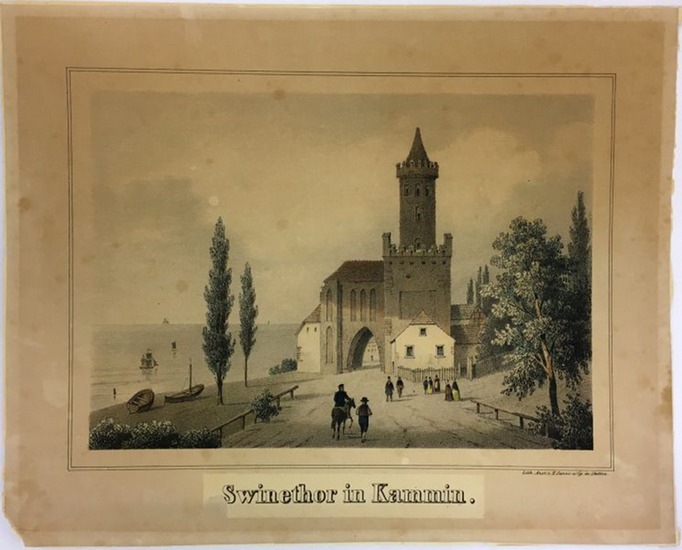 Swinethor in Kammin. Kolor. Lithographie bei E. Sanne u. Cp. Stettin. 1846. Unterhalb der Darstellung mittig mit montiertem Original-Titel "Swinethor in Kammin.". 13,5 x 19,2 cm. Papier: 20,5 x 25,5 cm. Kolorierte Lithographie aus: Pomerania. Geschichte u. Beschreibung des Pommerlandes zur Förderung der pommerschen Vaterlandskunde (Stettin: E. Sanne 1844-1846). - Insgesamt etwas stärker gebräunt und mit blassen kleineren Braunflecken. Die linke untere Ecke mit kleiner Fehlstelle. Verso an der Blattkante umlaufend hinterlegt.