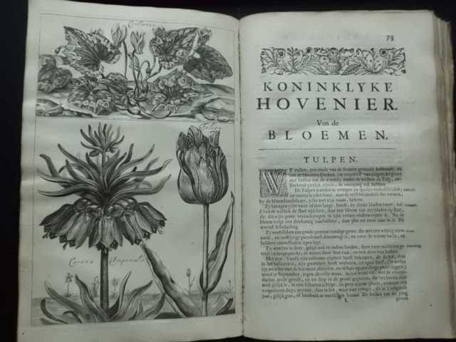 De Koninglycke Hovenier. Aanwyzende De Middelen om Boomen, Bloemen en Kruyden, te Zaayen, planten, aen queeken en voort teelen. Met Konstige Koperen Platen verciert Door D. H. Cause Schul. Amsterdam, Marcus Doornick, (1676). 4°. 2 Bll., 224 S., Titelkupfer mit allegorischer Ansicht, 2 Kupfer mit Gartenansichten, 13 Kupfer mit 26 Abbildungen von Pflanzen und Früchten, 16 Kupfer mit 32 Gartenplänen. Original-Lederband d. Zt. (Einband ber. u. best., Vors. fehlt, 1 Bl. lose, insgesamt guter Druck). Anhängend: Commelin, Johannes, Nederlantze Hesperides, Dat is, Oeffening en Gebruik Van de Limoen- en Oranje-Boomen. Gestelt na den Aardt, en Climaat der Nederlanden. Met kopere Platen verçiert Door J. Commelyn. Amsterdam, Marcus Doornik 1676. 1 Bl. 47 S. 26 Kupfer (2 Kupfer lose, 2 Kupfer anger.). In niederländischer Sprache. Erste Auflage der zwei wichtigsten hollndischen Bücher zur Gartenarchitektur im 17. Jahrhundert.