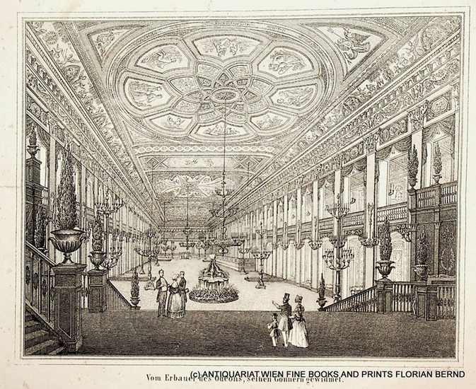 WIEN II, Odeongasse 2 a-10, ODEON Innenansicht wohl. ca. 1845 ca. 1845. original Lithographie von Berndt, Bildformat ca. 15,5 x 20 cm, teils mit unterlegten Stellen. Das sog. Odeon wurde 1844/45 als Tanzsaal, Festsaal und Konzertsaal errichtet, und war w?hrend der 1840er Jahre das f?hrende Etablissement. Am 28. Oktober 1848 im Zuge der Revolutionsk?mpfe ausgebrannt vgl. Czeike IV, 440 f.