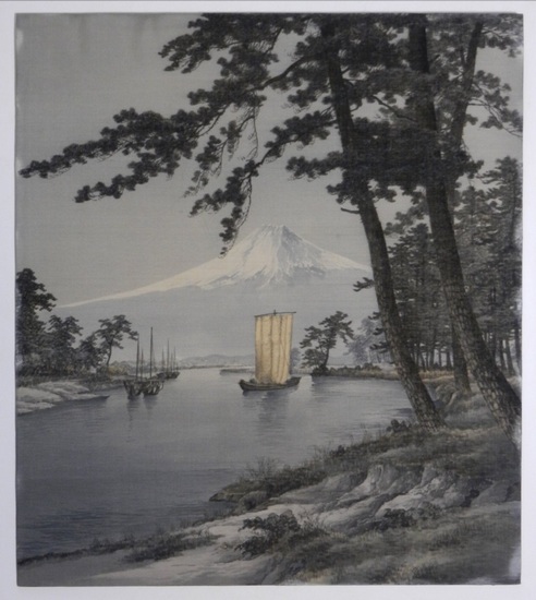 Japanische Landschaft mit Booten und dem Fuji im Bildzentrum - um 1920/1930. Bedruckter Stoff, vermutlich Seide, verso auf Pappe montiert. Nicht signiert, ca. 60 x 53 cm. / Japanese landscape with boats and Mount Fuji in the image center - around 1920/1930. Printed fabric, probably silk, mounted on cardboard on the reverse. Not signed, approx. 60 x 53 cm. _. [Ein paar Druck- bzw. leichte Schabstellen, links oben geringfügig fleckig, die Pappe verso mit einigen Nadellöchern, sonst gutes Exemplar / A few pressure or slight scraping marks, slightly stained on the top left, the cardboard with pinholes on verso, otherwise good copy].