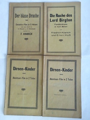 3 Theaterstück-Drehbücher bzw. Skripte in 4 Bänden um, Ohne Verlagsangaben, 1910. 43 Blatt/55 Blatt/59 Blatt/46 Blatt, auf Durchschlagpapier, kartonierte Original-Einbände, quart, (Rücken mit kleinen Einrissen/Einbände leicht gebräunt und mit Knickspuren)---- Enthalten: Der blaue Drache. Detektiv-Film in 5 Akten, nach einem Entwurf von O. Filbrandt und H. Bellenbaum / Die Rache des Lord Birgton. Familiendrame in fünf Akten; von Friedrich Kranich und Ellen Hoß / Dirnen-Kinder. Abenteuer-Film in 2 Teilen; von Friedrich Kranich / Die Skripte stammen aus der Hand des Prof. F. Kranich (1880 - 1964). Er war Professor für Theaterbau und Bühnentechnik in Hannover -.