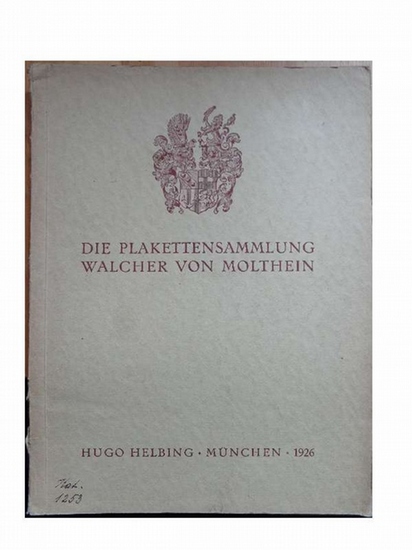 Die Plakettensammlung Alfred Walcher Ritter von Molthein, Wien. Italienische, spanische, deutsche, niederländische, französische Arbeiten des 15.-18. Jahrh. Versteigerung in der Galerie Hugo Helbing. 1926. Vorwort, 49 S.+ 40 Tafeln. 4°. Ehem. Biblio.-Exemplar. - Einband mit dezenter Biblio.-Nummerierung; Rücken am oberen & unteren Kapitalbereich eingerissen (wurde restauriert); Besitzvermerk durch Stempel auf Titelblatt; Schnitt leicht stockfleckig; Innen: sehr guter Zustand!.