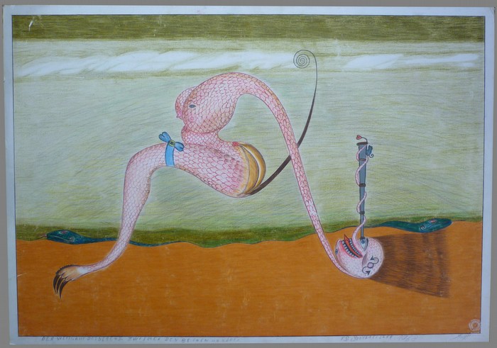 Der Wettlauf des Lebens zwischen den Beinen und Kopf. Farbstift auf Pappe. 1958. 51x72,5 cm. Unten mit Bleistift bezeichnet signiert und datiert. Rückseitig signiert.