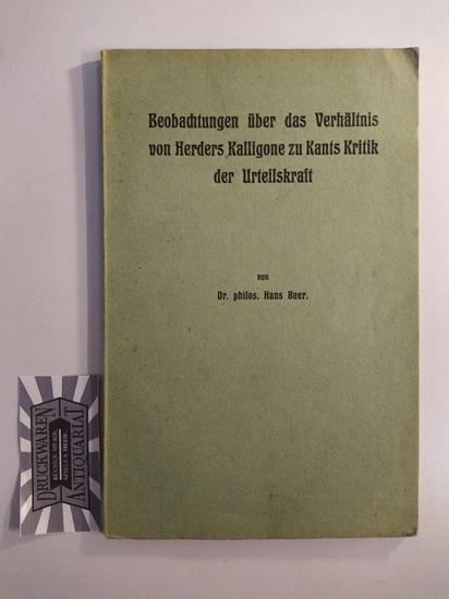 Beobachtungen über das Verhältnis von Herders Kalligone zu Kants Kritik der Urteilskraft. Heidelberg: Karl Rössler, 1907. 74 S. Kart., broschiert. Einband berieben, bestoßen und etwas fleckig/gebräunt, Schnitt fleckig, Papier stellenweise etwas fleckig und gebräunt, Titellei mit kleinerem Einriß/Abriebstelle (vermutlich durch das Ausradieren eines Namenseintrages), sonst gut erhalten.
