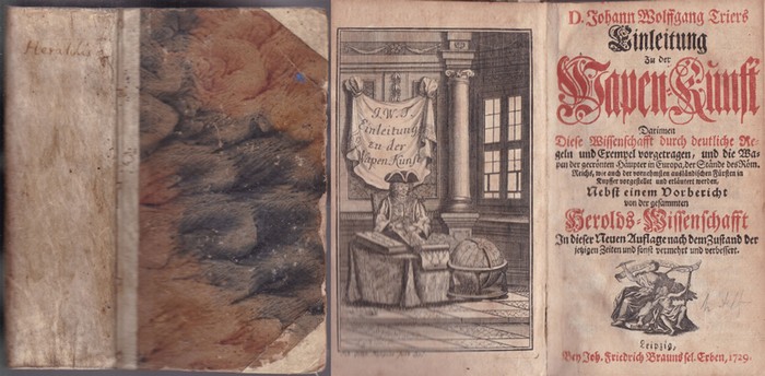 D. Johann Wolffgang Triers Einleitung Zu der Wapen-Kunst. Darinnen Diese Wissenschafft durch deutliche Regeln und Exempel vorgetragen, und die Wapen der gecrönten Häupter in Europa, der Stände des Röm. Reichs, wie auch der vornehmsten ausländischen Fürsten in Kupffer vorgestellet und erläutert werden, Nebst einem Vorbericht von der gesammten Herolds-Wissenschafft. In dieser Neuen Auflage nach dem Zustand der jetzigen Zeiten und sonst vermehrt und verbessert. Leipzig, Joh. Friedrich Braun, 1729. kl 8°, Halbpergamenteinbd., 8 Bl., 648 S., 7 Bl. u. 135 Wappentafeln - Kanten berieben, mitunter etwas nachgedunkelt, wenige Glossen, sonst wohl erhaltenes Exemplar mit einigen handkolorierten Wappentafeln.