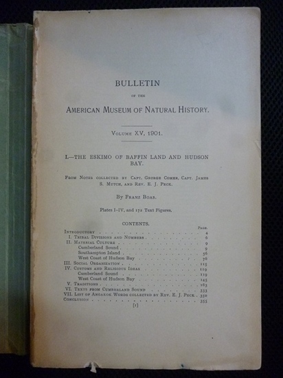 The Eskimo of Baffin Land and Hudson Bay: From Notes Collected by George Comer, James S. Mutch, E.J. Peck, Volume 15, Part 1 _ Original Edition - ( Bulletin of the American Museum of Natural History ) Vol. XV, Part 1 New York,, 1901. 370 S., with 172 Text Figures and Plates I-IV, Gr.-8°, Broschiert. Original Buch, ohne Einband, Pappumschlag lose dabei. ( original Book without Jacket ).