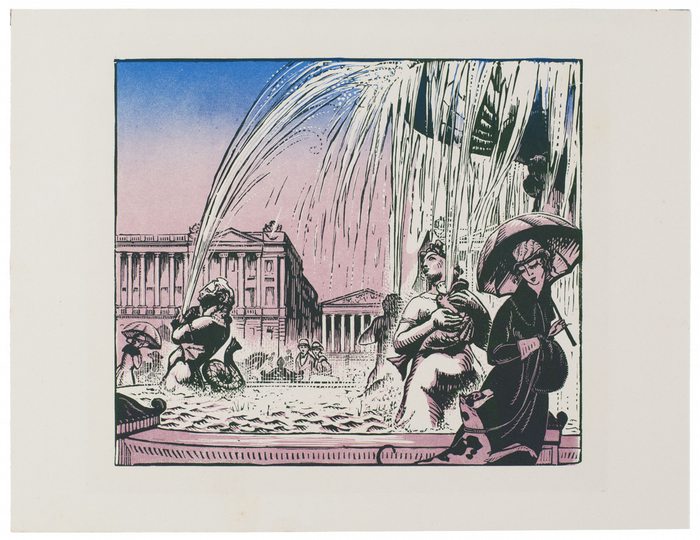 Paris, la Place de la Concorde. _. Farbholzschnitt, 1921, auf cremefarbenem Velin. Darstellungsgröße 19,4:22,4 cm, Blattgröße 25,2:32,6 cm. Robert Bonfils war ein sehr vielseitiger Künstler und war auf allen Gebieten der Graphik tätig, aber auch als Bildnis- und Wandmaler. Er war Mitglied des Salon d?Automne und stellte seit 1923 im Salon des Tuileries und im Salon des Arts Décoratives aus.