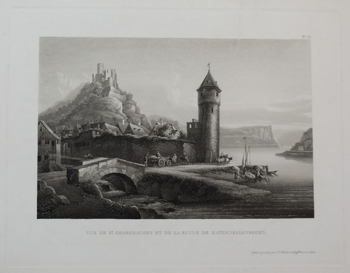 Vue de St. Goarshausen et de la ruine de Katzenellenbogen. Schweiz, Aquatintaradierung von Johann Ludwig Bleuler, Schaffenhausen, 1840. 19,5x29,7 cm.