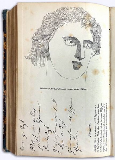 Kaspar Hauser. Sein Wesen, seine Unschuld, seine Erduldungen und sein Ursprung in neuer, gründlicher Erörterung und Nachweisung. Mit einer Anzahl bisher noch unveröffentlichter Aufsätze, Nachrichten und Erklärungen gewichtvoller Beobachter, Zeugen und Sachkenner, namentlich auch zur Ergänzung des theils an sich mangelhaften, theils noch ungenügend und mit Weglassung relevanter Bestandtheile mitgetheilten Actenmaterials. Mit einer lithographirten Tafel. - [ANGEBUNDEN:] Kaspar Hauser. Seine Lebensgeschichte und der Nachweis seiner fürstlichen Herkunft. Aus nunmehr zur Veröffentlichung bestimmten Papieren einer hohen Person. Von....von K....[d.i. Georg Friedrich Kolb]. Beide Erstausg. Regensburg, Verlag von A. Coppenrath, 1873, 1883. XXIV, 464 S., mit 1 Falttaf. (Faksimile von Hausers Zeichnungen u. Schreibübungen) / IV, 130 S., 8°, Priv. Halbleinen d. Zt. Hayn-Gotendorf IX, 266. - Georg Friedrich Daumer (1800-1875), Schriftsteller u. Religionsphilosoph, war zeitweise der Erzieher des Kaspar Hauser, welcher 1833 ermordet wurde. Vorliegend die EA von Daumers letzter Veröffentlichung zur Hauser-Frage. - Einband berieben u. bestossen; Aussengelenke eingerissen; beide Titel mit Besitzervermerken; tlw. braunfleckig, gelegentliche Anstreichungen u. Marginalien; im angebundenen Titel eingeklebter, handschriftl. Stammbaum, sonst recht gutes Expl.