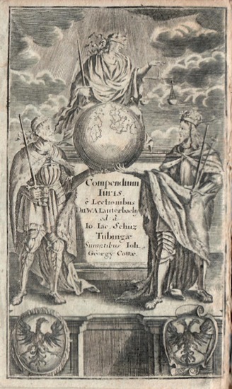 Compendium Juris brevissimis verbis, sed amplissimo sensu & allegationibus, universam fere materiam juris exhibens: e lectionibus excellentissimi domini W. Ad. Lauterbachii, J.U.D. quondam Prof. Primar. Tubigensis, tandem directoris consistorii ecclesiast. ducatus Wirtemb. &c. Primum usui privato collectum, postea vero multorum rogationibus publico datum à B. Dn. Joh. Jacobo Schützio (Johann Jacob Schütz). Nunc noviter singulari studio & accuratione ab innumeris mendis repurgatum, & collatis omnibus hucusque evulgatis Editionibus, exactissime emendatum. Accessere in gratiam Studiosae Juventutis ubique loca parallela, affinia, correlata, & alia Compendium hocce copiose & insigniter ex se ipso illustrantia, peculiari industria selecta, & ad marginem cujusvis paginæ fideliter allegata. Cum Speciali Privilegio Cæsareo, Polonico, & Saxonico. Nur Tomus / Band I. Tubingae, Francofurti & Lispiae (Tübingen, Frankfurt, Leipzig) / Sumptibus Joh. Georgii & Christ. Godofr. Cottae (Johann Georg & Christian Gottfried Cotta), o.J. (wohl 1722). Frontispiz, 13 nn., 368 S. und nn. zwischengebundene, handschriftliche Kommentarseiten. 8° (eigentlicher Block nur Kl-8vo., Kommentarseiten größer). Ledereinband der Zeit (auf Pappe) mit goldgepr. Rücken, 5 Bünden und allseitigem Rotschnitt. Leder an vorderer Rückkante und unten an hinterer komplett fehlend. Einband berieben und beschabt, Vorsatz etwas fleckig, mit Marginalie und unleserlichem (Kloster?)-stempel, Block etwas wellig und etwas fleckig, Schnitt der Kommentarseiten gebräunt, hinten kleiner Wurmgang (nur Kommentarseiten betreffend), gelegentliche Unterstreichungen. Dadurch, dass handschriftliche Seiten in größerem Format beigebunden wurden, ist das eigentliche Buch altersgemäß recht gut erhalten.