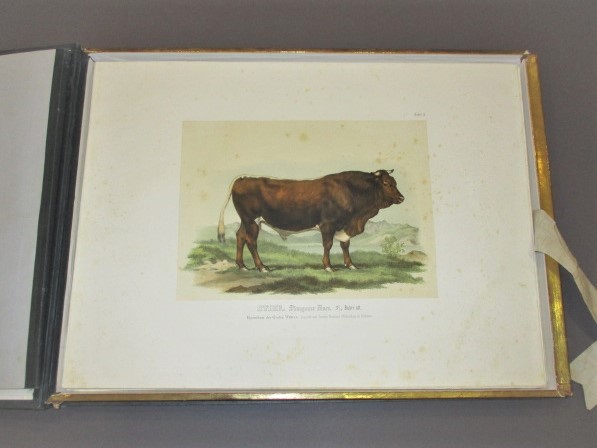 Abbildungen österreichischer Rindvieh-Racen. Hrsg. im Auftrage des k. k. Ministeriums des Innern. Wien, Staatsdruckerei, 1859. XII, 24 S. 27 lose farbige lithographierte Tafeln. Quer-Gr.-Fol. OHLwd. ((fleckig, kl. Randeinrisse). Wien, Staatsdruckerei, 1859. XII, 24 S. (Textheft) und 27 lose farbige lithograph. Tafeln. Quer-Gr.-Fol. (Textheft:) OKart. (Rücken mit Lwd. verstärkt, etw. gebräunt und fleckig) zusammen mit den losen Tafeln in OLwd.-Mappe (bestoßen, Rückengelenk mit Randeinrissen). Erste Ausgabe, selten. - Nissen 4518. - "Die Zeichnungen wurden von Joseph Zimmermann gefertigt (Quelle: nach einem hs. zeitgenöss. Eintrag), und zwar nach den von der k. k. Staatsdruckerei angefertigten Fotografien, die während einer Ausstellung der k. k. Landwirthschafts-Gesellschaft in Wien im Mai 1857 gemacht wurden" (Katalogisat der ÖNB) - "Da genaue naturgetreue Abbildungen unserer wichtigsten Viehracen noch wenig vorhanden und verbreitet sind solche Bilder aber, mit näherer Angabe über Eigenschaften, Pflege, Verbreitung u. s. w. versehen, wesentlich zur Kenntnis und besseren Benutzung der Racen beitragen können, so ist jene Gelegenheit über Auftrag Sr. Excellenz des Ministers des Innern benützt worden, um aus den dort aufgestellten einheimischen oder den bei uns längst eingebürgerten fremden Racen einzelne hervorragende Exemplare photographisch aufnehmen zu lassen" (Vorwort). - Titel gestempelt. Vorderer Buchinnendeckel mit hs. Nummer. Durchgehend etw. fleckig.