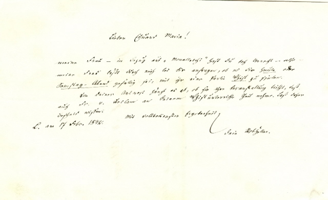Eigenh. Brief mit U. (?Rob. Heller?). ?L.?, 17. Februar 1842. 1 S. Qu.-8vo. Mit eh. Adresse (Faltbrief). An den Schriftsteller Eduard Maria Oettinger (1808?1872): ?[...] meine Frau läßt durch mich bei Dir anfragen, ob es Dir heute oder Samstag-Abend gefällig sei, mit ihr eine Partie Whist zu spielen. Von Deiner Antwort hängt es ab, ob sie ihre Veranstaltung trifft, daß auch Fr. v. Reclam an Deinem Whistunterrichte theil nehme [...]?. ? Robert Heller war vorwiegend als Herausgeber von Zeitschriften (?Deutsche Zeitung? und ?Hamburger Nachrichten?) und Almanachen (?Rosen?, 1838, ?Perlen?, 1842) tätig. ? E. M. Oettinger war Herausgeber der von 1842 bis 49 erscheinenden satirischen Zeitschrift ?Charivari?, für die neben Glaßbrenner und Gutzkow auch Heinrich Heine, Heinrich Hoffmann von Fallersleben, Heinrich Laube, Moritz Gottlieb Saphir, Friedrich Rückert und Kathinka Zitz Beiträge verfaßten; daneben veröffentlichte er Gedichte, Erzählungen, Dramen und humoristische und historische Romane sowie eine sechsbändige ?Bibliographie biographique universelle?.