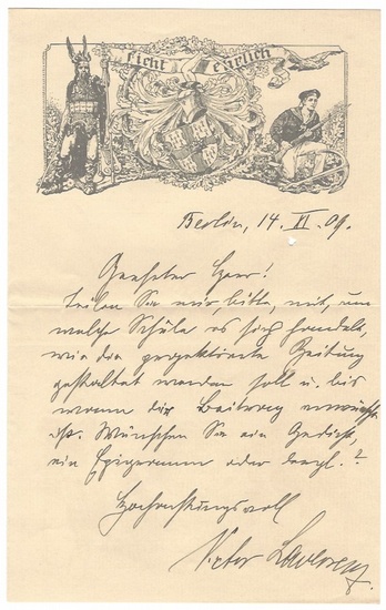 Eigenh. Albumblatt mit U. sowie eh. Brief mit U. Berlin, 14. und 18. November 1909. Zusammen 2 SS. 8vo. Doppelblätter mit illustr. Briefkopf. Mit Umschlägen. An Martin Flaum: "[...] Teilen Sie mir, bitte, mit, um welche Schule es sich handelt, wie die projektierte Zeitung gestaltet werden soll u. bis wann der Beitrag erwünscht ist [...]" - "Mich stachelt Alles, was mir widerfährt: | Erfolg treibt vorwärts mich zu neuem Schaffen, | Und Mißerfolg, die Scharte auszuwetzen [...]". - Laverrenz schrieb Militärhumoresken, Abenteuer- und Reiseberichte sowie Schilderungen des Berliner Volkswitzes.