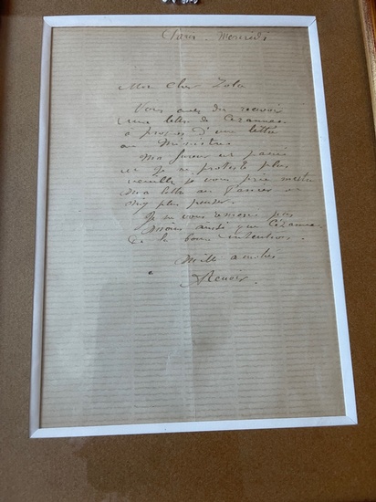 Eigenhändiger Brief mit Unterschrift. Paris, ?mercredi?. 8vo. 1 p. Gerahmt. An den Schriftsteller Emile Zola über einen Brief von Cézanne: ?Vous avez dû recevoir une lettre de Cézanne à propos d?une lettre au Ministre. Ma fureur est passée et je ne proteste plus. Veuillez je vous prie mettre ma lettre au panier et n?y plus penser. Je ne vous remercie pas moins ainsi que Cézanne de la bonne intention.?.