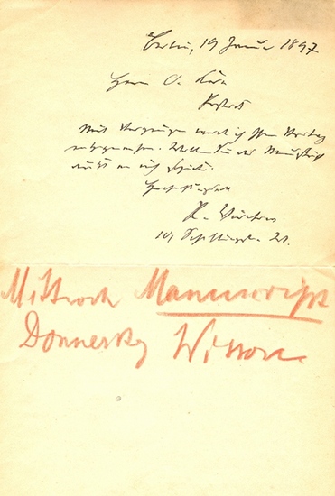 Eigenh. Brief mit U. Berlin, 19. I. 1897. ? S. auf Doppelblatt. 8vo. An den Philologen und Religionshistoriker Otto Kern (1863?1942) in Rostock: ?Mit Vergnügen werde ich Ihren Vortrag entgegennehmen. Wollen Sie das Manuskript direkt an mich schicken [...]?. ? Kern habilitierte sich 1894 für klassische Philologie in Berlin und ging 1897 als a.o.Prof. nach Rostock, wo er seit 1900 als Ordinarius lehrte. Von 1907 bis zu seiner Emeritierung 1931 wirkte er in Halle/Saale. Neben Arbeiten zur Epigraphik arbeitete er vor allem über die Orphik und verfaßte biographische Skizzen zur Altertumswissenschaft. ? Darunter von fremder Hand in Rotstift notiert: ?Mittwoch Manuscript Donnerstag Wisson [?]?. ? Auf dem leeren Bl. 1 der gedr. Bestimmungen zur Publikation von Beiträgen in der von Virchow und Holtzendorff herausgegebenen ?Sammlung gemeinverständlicher wissenschaftlicher Vorträge?.