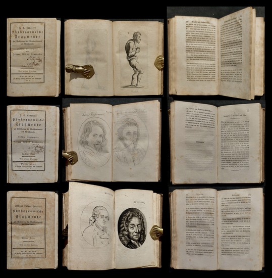 Physiognomische Fragmente zur Beförderung der Menschenkenntniss und Menschenliebe. Verkürzt herausgegeben von Johann Michael Armbruster. Winterthur, H. Steiners und Compagnie, 1783-1787. 8°. X, 246 S. Mit 91 (von 92) Tafeln auf 91 (von 92) Tafeln; 2 Bl., 329 S., (3) S. Mit 112 auf 114 Tafeln; 1 Bl., 320 S. Mit 150 (von 151) Tafeln auf 150 (von 151) Tafeln. Pappbände der Zeit. Band 1-3 (von 4). 1830 erschien ein 4. Band. - (Einbände beschabt. Name auf Titelblättern. Stockfleckig. Viele Tafeln mit Beschriftungen in Bleistift. Band 1: S. 113/114 nach S. 96 eingebunden. Im letzten Teil fehlt die Tafel 23. Band 3: S. 31/32 lose. Tafel 125 fehlt).