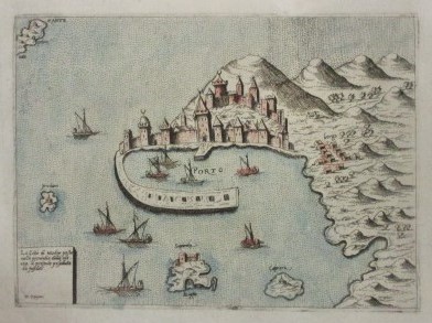 "La Citta di Modon posta nella provintia della morea al presente dorredutto da jnfideli. D. Zenoni". Ankolorierte Radierung aus: Donato Bertelli, Civitatum aliquot insigniorum et locorum magis munitorum exacta delineatio. Venedig, Bertelli, 1574. Ca. 15,5 cm x 20 cm. Bifolco Tafel 686. - Erster Zustand dieser sehr seltenen Ansicht von Methoni (italiensisch Modoni) am südwestlichen Ende der Peloponnes . - Die Radierung stammt aus dem den Türkisch-Venezianischen Krieg von 1570 bis 1573 behandelnden Atlas von Donato Bertelli, von dem nur 2 komplette Exemplare in italienischen Bibliothken bekannt sind und 5 Exemplare des Kupferstichs bei Bifolco erwähnt werden. - Gereinigt und restauriert.