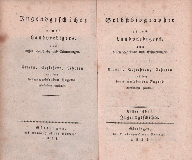 Selbstbiographie eines Landpredigers, aus dessen Tagebuche und Erinnerungen. Eltern, Erziehern, Lehrern und der heranwachsenden Jugend insbesondere gewidmet. THEILE 1-3 in 1 Band (= komplett). Göttingen, Vandenhoeck und Ruprecht, 1831-1835. 1 Bl., 140 S; VIII, 174 S., 1 Bl.; VIII, 120 S., 1 Bl. (18 x 11 cm). HLn. d. Zt. mit RVergold. [1]: Jugendgeschichte eines Landpredigers, aus dessen Tagebuche und Erinnerungen. / [2]: Der Student oder der akademische Cursus eines Landpredigers, aus dessen Tagebuche und Erinnerungen. / [3:] Der Candidat oder Candidaten-Leben eines Landpredigers, aus dessen Tagebuche und Erinnerungen. - Gedruckt bei Friedrich Ernst Huth. - Nicht bei Holzmann/ Bohatta. - "Es soll aber das ganze Werk ... die Geschichte meines inneren religiösen, sittlichen Lebens liefern, soll zeigen, wie und wodurch der gnädige, barmherzige Gott von Kindheit an mich zu sich zog, daß und wie ich religiös erzogen, zur Gottseligkeit geführet wurde, wie ich einfältig gläubig, liebend und hoffend meine Kindheit verlebte, dann anfing zu klügeln, zu zweifeln, zu irren, zu sündigen und also das Paradies der Kindheit verlor, verscherzte, endlich aber durch Gottes Gnade zur Buße, zum Glauben und zur Gottseligkeit zurückgeleitet wurde..." (Tl. 1, S. 6 f.). - Leicht berieben, Rücken u. stellenw. innen stockfleckig; Exlibris des schlesischen Malers, Zeichners u. Graphikers Georg Rasel (1882-1945) für "Regierungsrat Mueller-Baudiss" mit Ansicht des Gutes Groß-Baudiß, Kreis Ohla, Schlesien, datiert 1913. - Im Ganzen gutes Exemplar.