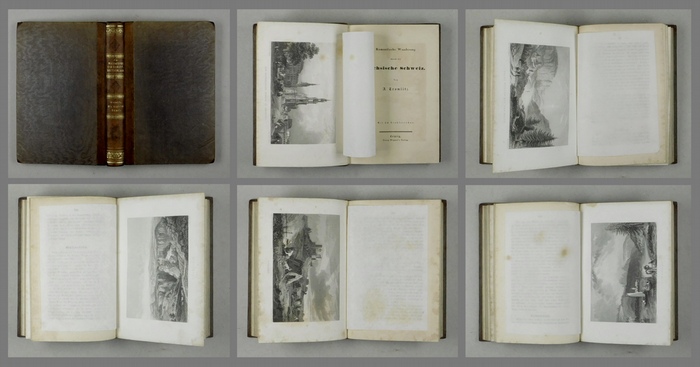 Romantische Wanderung durch die Sächsische Schweiz. Leipzig, Georg Wigand's Verlag., (1836). Gross-8°. 240 S. Mit 30 Stahlstichen auf Tafeln. Halblederband der Zeit mit goldgeprägtem Rückentitel und blindgeprägter Rückendekoration. Originalausgabe. - Mit dem Reihentitel "Das malerische und romantische Deutschland. Band 1.» - Die Tafeln der Ansichten alle mit den Seidenpapieren. - Mit längerer handschriftlicher privater Widmung auf dem ersten Blatt. Papier durchgehend mässig gebräunt, stellenweise fleckig.