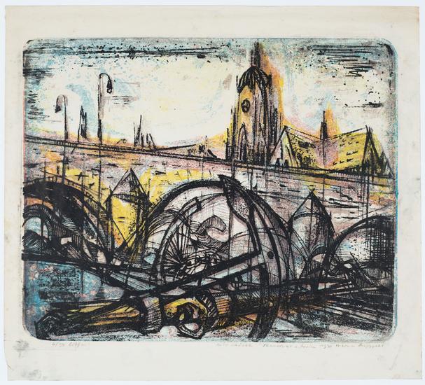 Frankfurt am Main, Alte Brücke. _. Farblithographie, 1917, auf cremefarbenem Velin, bezeichnet, datiert und signiert. Darstellungsgröße 50,4:62,5 cm, Blattgröße 62,7:69,5 cm. ? In den Rändern farb- und fingerfleckig, etwas knittrig. Nr. 4 von 50 Exx.