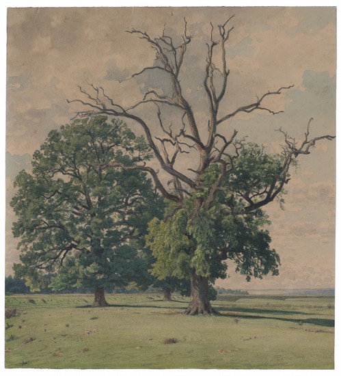 Gruppe von drei alten Eichen mit Blick in die weite Landschaft. _. Aquarell, über Bleistift, auf chamoisfarbenem Papier. 34,6:31,6 cm. Eindrucksvolle Naturstudie von hoher zeichnerischer Qualität. - Die Eiche war der Baum, den Crola am liebsten zeichnete, so hatte er schon in München den Namen ?Eichen-Maler? erhalten. Crola besuchte 1820 die Zeichenschule in Meissen und erhielt in Dresden Unterricht bei J.C. Klengel (1751-1824) und J.D. Schubert (1761-1822). Von 1825-28 war er in Dresden ansässig. Er wurde von C.D. Friedrich (1774-1840) und J.C.C. Dahl (1788-1857) gefördert. Zwischen 1828 und 1830 hielt er sich in Gotha, Ilsenburg, Wernigerode und Coburg auf, von 1830-1838 in München. 1838 folgte die Niederlassung in Ilsenburg, von wo aus er Reisen nach Schweden, Italien und in die Schweiz unternahm.