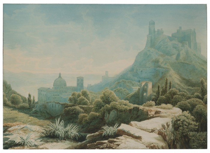 Auf einer Höhe gelegenes Kloster und Burg vermutlich in Italien. _. Aquarell in verschiedenen Blau-, Grün- und Brauntönen, über Bleistift, auf Whatman-Papier. 31:43,3 cm. Anfangs als Porzellan- und Dekorationsmaler tätig, brachte ihn erst eine Reise nach der Schweiz und nach Italien auf die Landschaftsmalerei. Außer W. Schirmer (1802-1866) und K. Blechen (1798-1840) gehört er zu den Begründern der älteren Berliner Landschaftsmalerei. Eine 1884 ausgestellte ?Aussicht auf Florenz? sowie die 1836 ausgestellte ?Eiche Tassos? verkündeten sogleich seine poetisch-romantische Naturauffassung, die in seinem Gemälde ?Abend auf der Hochalp? voll zum Durchbruch kam. Die Aquarelle, die er nach Skizzen anfertigte, die auf einer 1852 unternommenen Reise nach Dalmatien entstanden, zeigen ihn als Meister in dieser Technik. 1891 feierte Biermann das Jubiläum seiner 50jährigen Mitgliedschaft in der Berliner Akademie.