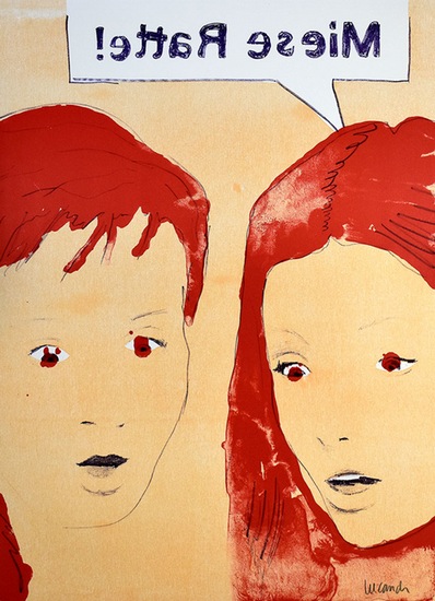 Miese Ratte. [2006]. [Signierte Original-Grafik: Kombinationsdruck / signed original graphic: combination print]. _. Robert Lucander, geboren 1962 in Helsinki. Finnischer Maler, Zeichner, Grafiker und Professor an der Universität der Künste Berlin. Studium 1989 bis 1995 an der Hochschule der Künste Berlin bei Marwan Kassab-Bachi. Original-Kombinationsdruck in drei Farben (Holzschnitt und Farblithografie) auf 225 g/qm Zerkall Büttenpapier, Druck durch Tabor-Presse, Berlin. Innerhalb der Abbildung von Robert Lucander in Blei signiert. Edition der Griffelkunst-Vereinigung, Hamburg, 2006. Griffelkunst, Verzeichnis der Editionen 324 C1. Maße Blatt/Abbildung: 65,0 x 47,0 cm. Sehr guter, tadelloser Zustand. Original combination print in three colors (woodcut and color lithograph) on 225 g/sqm Zerkall handmade paper, printed by Tabor-Presse, Berlin. Signed in lead by Robert Lucander within the image. Edition of the Griffelkunst Association, Hamburg, 2006. Griffelkunst, Index of Editions 324 C1. Sheet/image dimensions: 65.0 x 47.0 cm. Very good, immaculate condition.