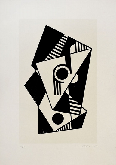 Geometrische Komposition. 1957. [Signierter Original-Linolschnitt / signed original linocut]. _. Walter Wohlschlegel, geboren am 8. Juni 1907 in Tumringen, gestorben 1999 in Freiburg. Deutscher Maler des Expressionismus später des deutschen Informel. Studium 1930 bis 1935 an der Akademie Karlsruhe, Meisterschüler von Prof. Albert Haueisen. Nummer 26 von 50 nummerierten Original-Linolschnitten auf Büttenpapier, unterhalb der Abbildung von Walter Wohlschlegel in Blei signiert, datiert (1957). Maße Blatt: 59,5 x 42,0 cm. Maße Abbildung: 44,5 x 28,0 cm. Blatt rückseitig mit kleiner Zahl. Sehr gutes Exemplar. Number 26 of 50 numbered original linocuts on handmade paper, signed in lead below the illustration by Walter Wohlschlegel, dated (1957). Sheet dimensions: 59.5 x 42.0 cm. Dimensions illustration: 44.5 x 28.0 cm. Sheet verso with small number. Very good copy.