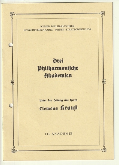 Eigenhänd. Signatur auf einem Programmheft der Wiener Philharmoniker Konzertvereinigung Wiener Staatsopernchor. Drei Philharmonische Akademien. III. Akademie. Mittwoch, den 12. April 1950, 20 Uhr im Großen Musikvereinssaal. Titelbl. mit eigenh. Signatur von Clemens Krauss. Wien, Wagner Druck 1949. 8°. 4 Bll. Bedruckte OBrosch. Gelocht, sonst gut erhalten. Titelblatt von Clemens Krauss (1893-1954) signiert. Krauss' Position gegenüber dem Nationasolzialismus gilt als umstritten, er arbeitete nach dem Krieg erst seit 1947 wieder an der Wiener Staatsoper. Er war in zweiter Ehe mit der Schauspielerin Viorica Ursuleac verheiratet.